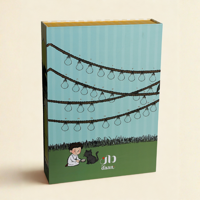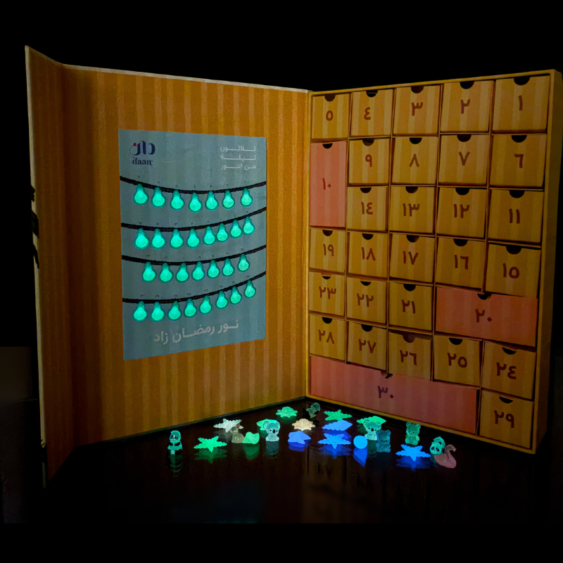 | Box Components | محتويات الصندوق | – ٣٠ درجًا داخليًا: يحتوي كل درج على بطاقة عمل صالح ولعبة تضيء في الظلام – 30 Individual Drawers: Each containing a "Good Deed" card and a glow-in-the-dark toy |